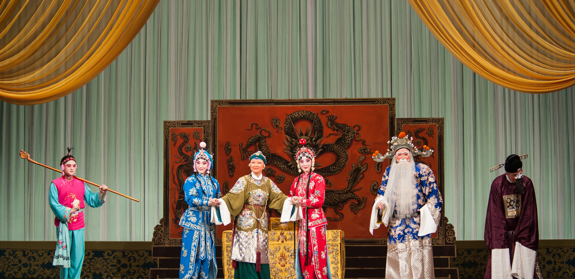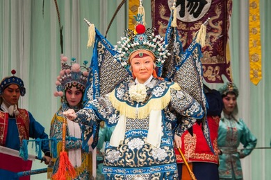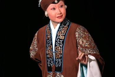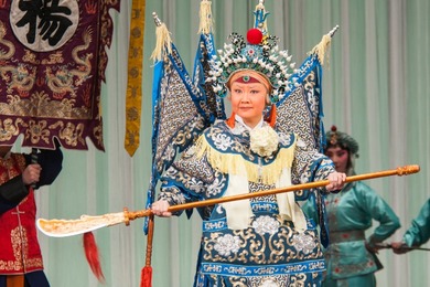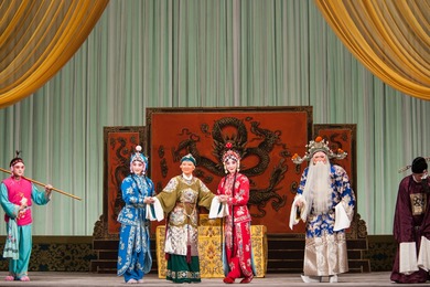 《佘太君抗婚·金殿》根据《杨八姐游春》改编而来,讲述佘太君忠言进谏,斥责昏君,为女抗婚终得胜利的故事。其中《金殿》一折中,“我还要一两星星二两月,三两清风四两云……”的唱段脍炙人口,唱腔苍劲宽亮,表演似喜实怒,充满讽刺喜剧的意蕴,充分展现了佘太君之智慧,老旦艺术之魅力。